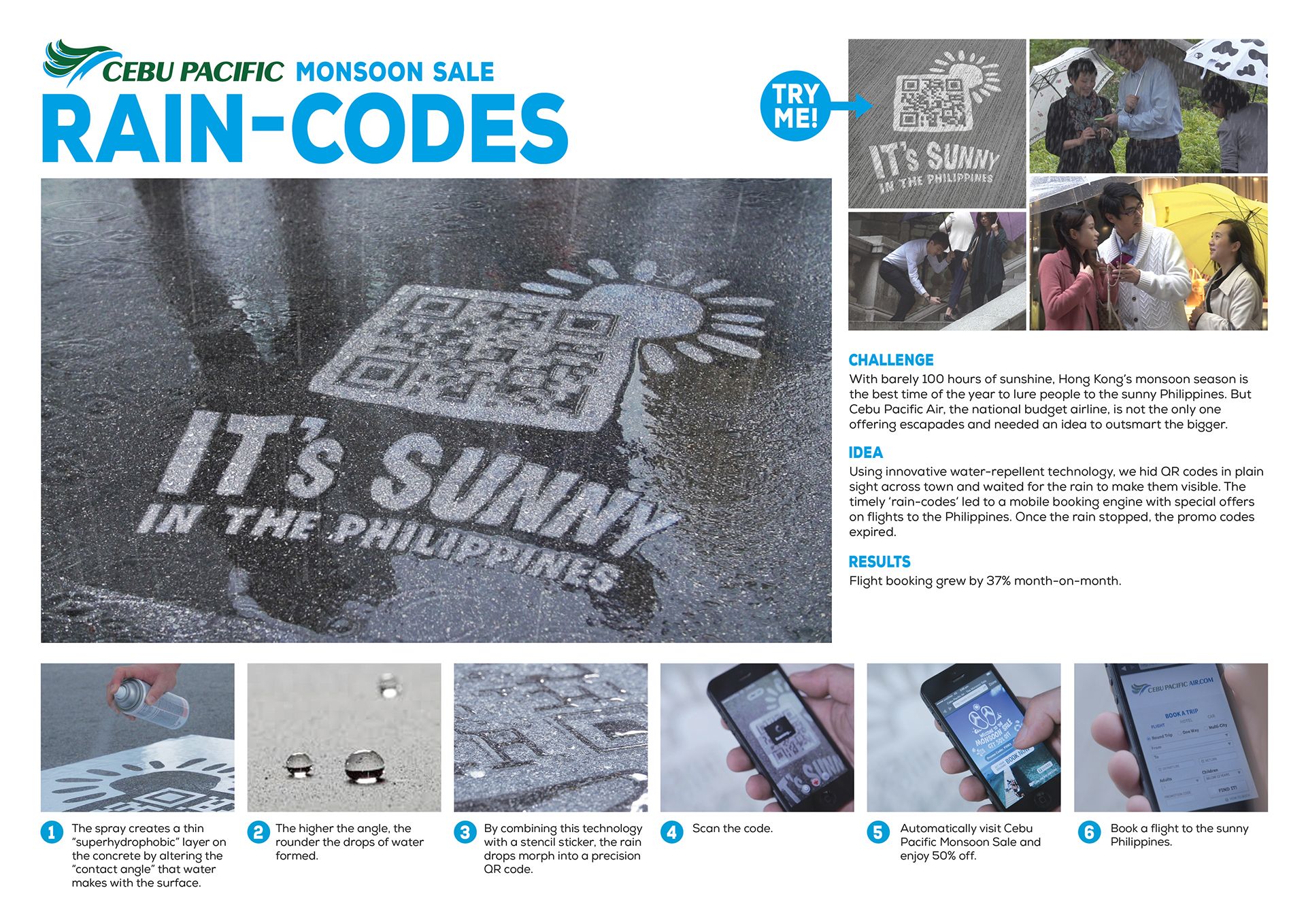 We hid our message in plain sight, using a water-repellent spray that revealed a QR code with access to the discounted fares only when it rained.